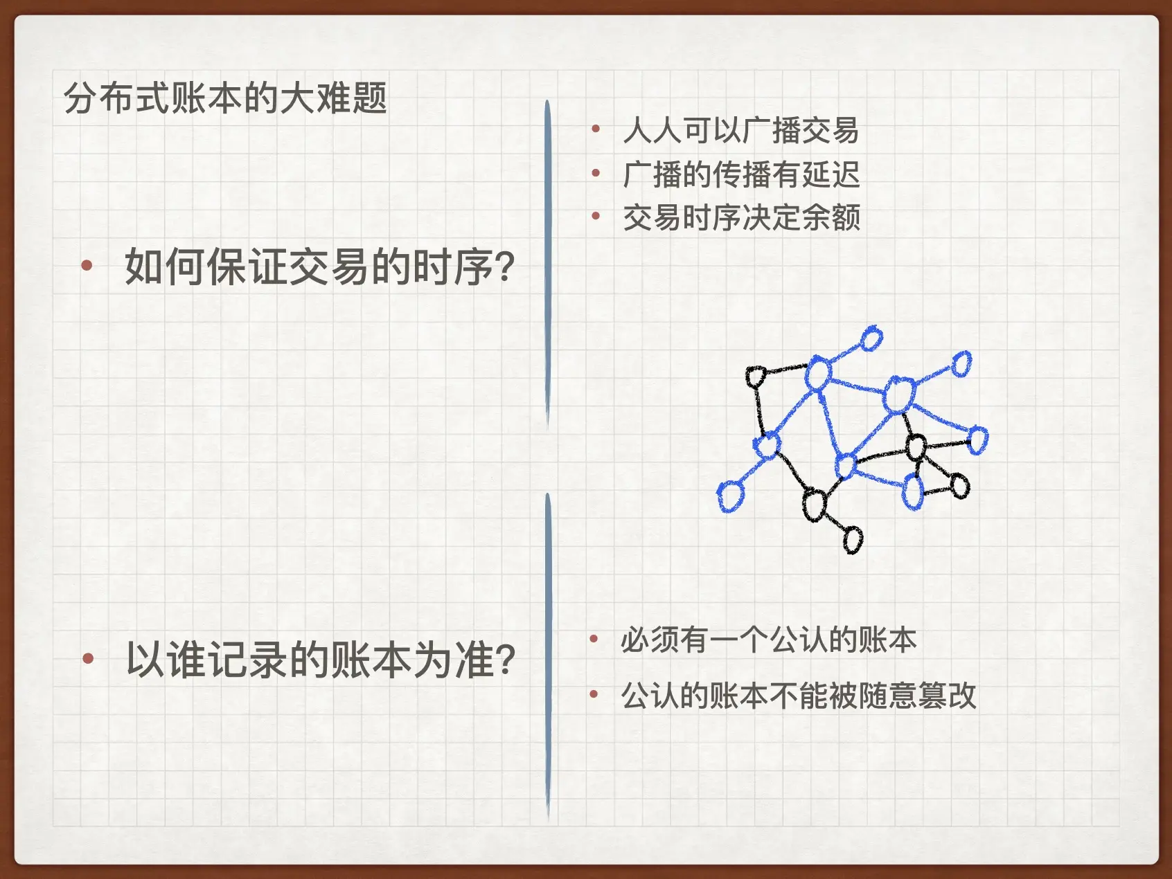 去中心化的网络,大家都能记账,那肯定就会有恶意节点故意漏记,也会有无辜节点因为网络问题漏记。你总不能以让全网所有节点都收到消息为准吧,也不能以大多数节点记的帐为准,因为攻击者可以恶意制造大量节点凑数。如何才能写一个大家公认的,不能被篡改的账本呢?