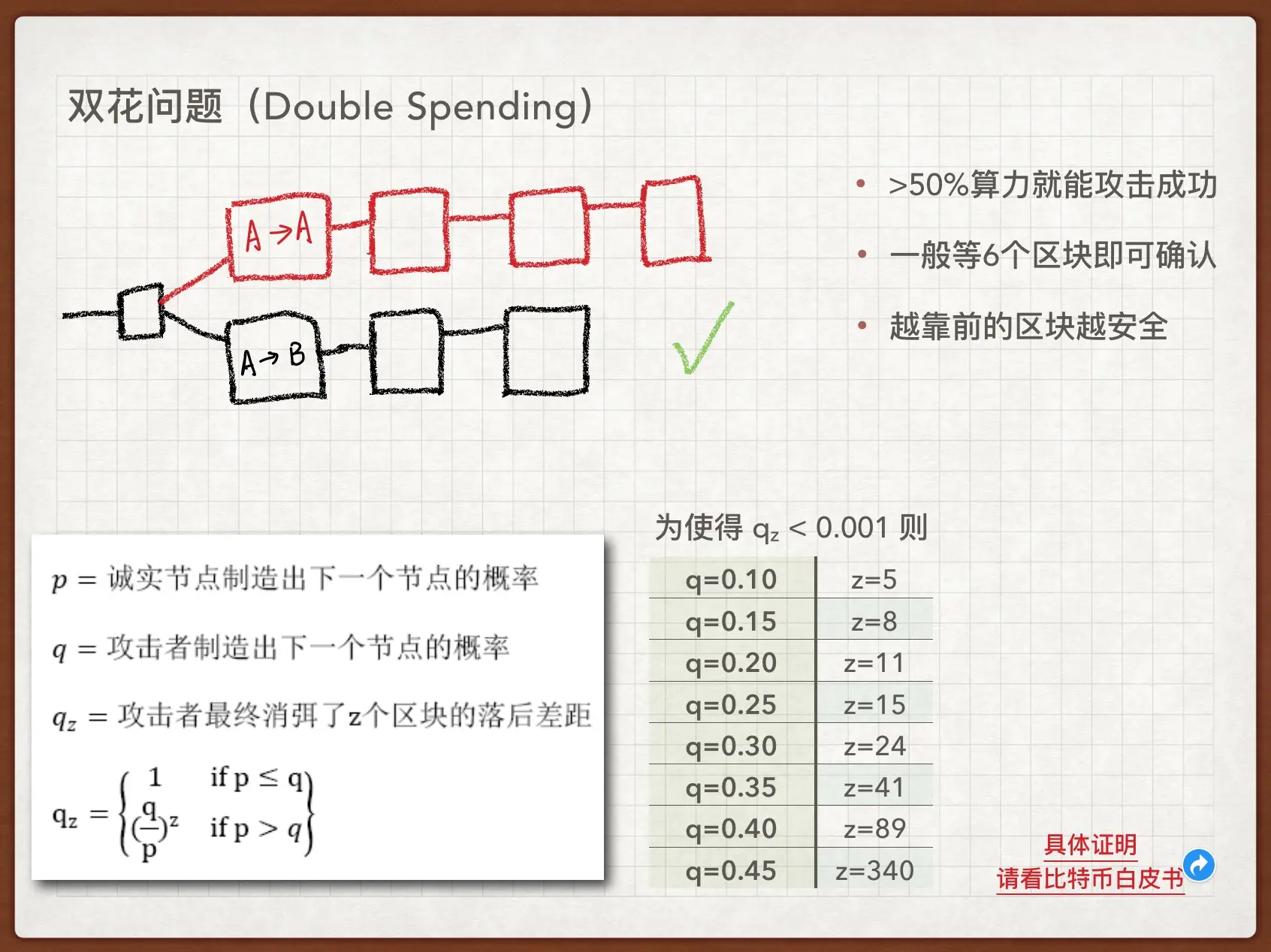 假设 A (攻击者)这边的算力只有 q (q<50%),那么攻击者最终消弥 z 个落后区块的概率为(如图),即攻击成功的概率。为了使攻击者攻击成功的概率小于0.001(小概率事件),则至少要 A→B 这个交易所在区块诞生后再等 z 个区块诞生之后才够安全。我们可以列出一个表格来,当 q=10% 的算力时,只需要等待5个区块即可……当 q=45% 时需要等待340个区块确认。