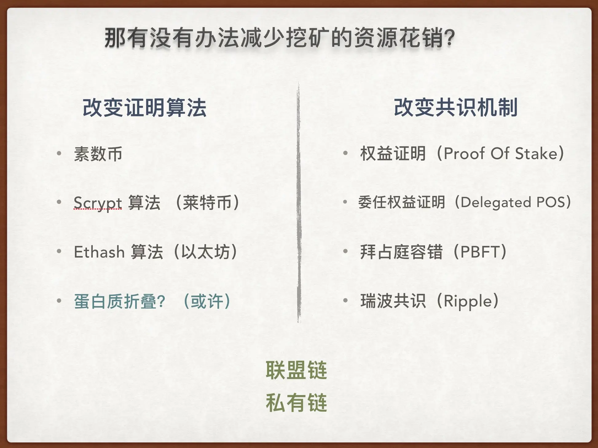 改变共识机制。既然工作量证明(POW)不可避免地要消耗巨大算力,何不换一种共识机制,不要工作量证明。于是出现了权益证明(POS)、委任权益证明(DPOS)等等,简单来说,POS把靠链外资产的保证(买矿机挖矿),转移到链内来(矿机和挖矿的钱转化成链上的『币