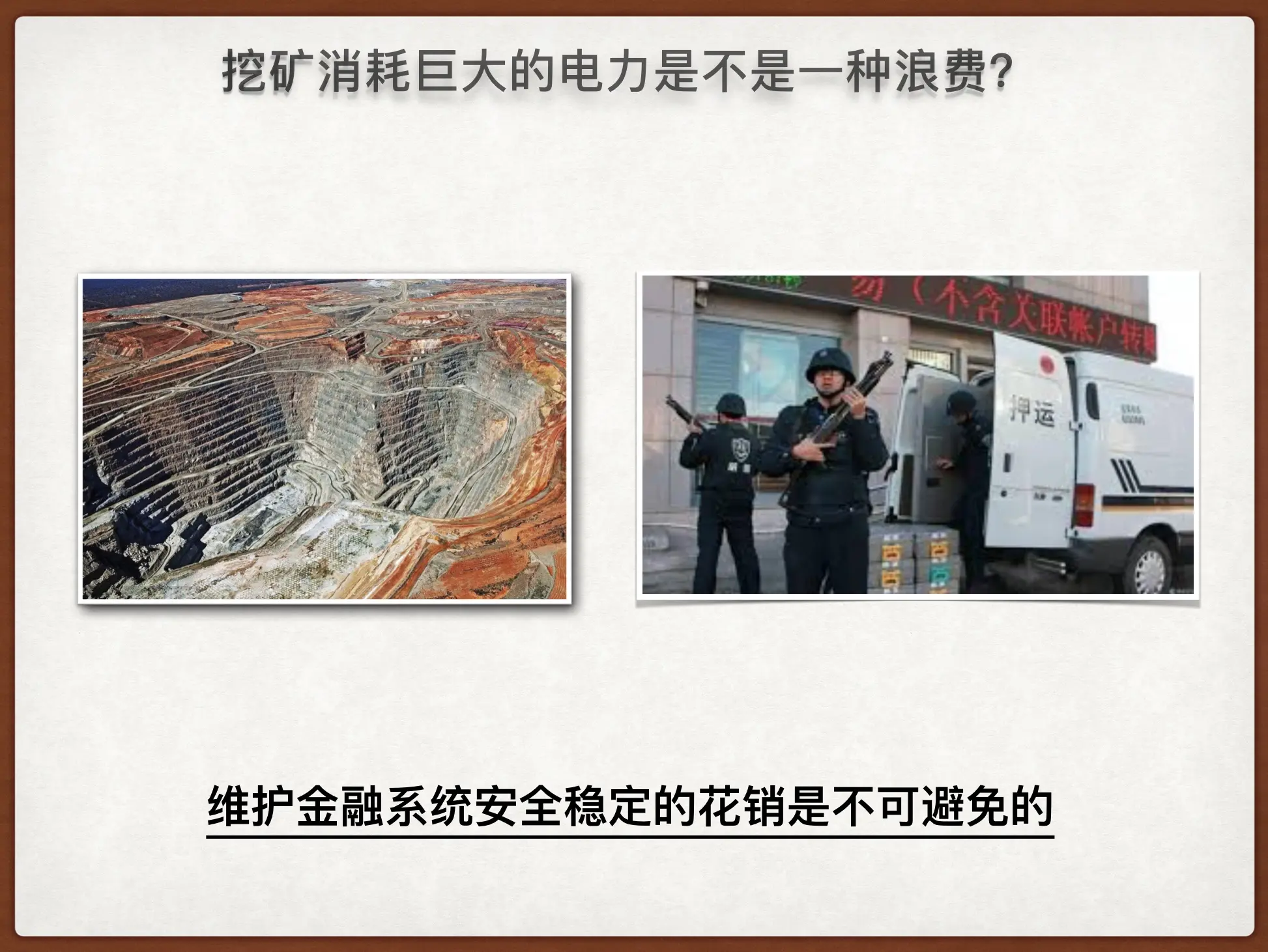 挖矿会消耗巨大的电力资源,这是不是一种浪费呢?是,但这是不可避免的。维护一个金融系统的安全稳定总是要付出巨额的成本,无论是现实世界的挖金矿的矿场,还是建银行仓库、安保防护、培训专业人员、开发银行系统、请最顶级专家……这些花费全球加起来并不比区块链挖矿所消耗的资源少。1200美元/盎司的黄金生产成本是1000美元,而且在生产的过程中需要花费巨大的人力开采、提炼,提炼的过程要用到汞之类的有毒物质,无论是对工人的健康危害还是对环境的破坏都很大。