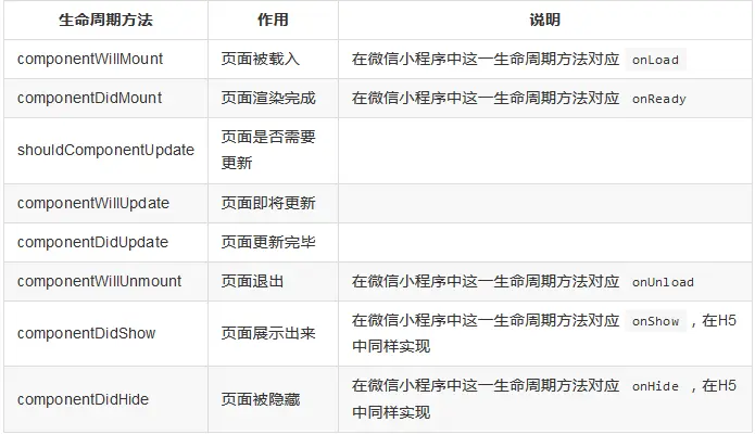 首先,Taro是基于React语法的,我们基本完全可以按照编写react的方式与习惯来编写小程序,至于编写完成之后的工作,就交给Taro强大的编译功能去完成吧。 这里觉得taro的编译做的还真的挺不错的,美中不足的是控制台经常报一个scope的错误,但是无关痛痒,重新保存就没事了。 其次,Taro的组件生命周期也基本上与React一致,组件生命周期与小程序生命周期对应关系,官网也有,除此之外因为是微信端,还增加了一些其他的生命周期。