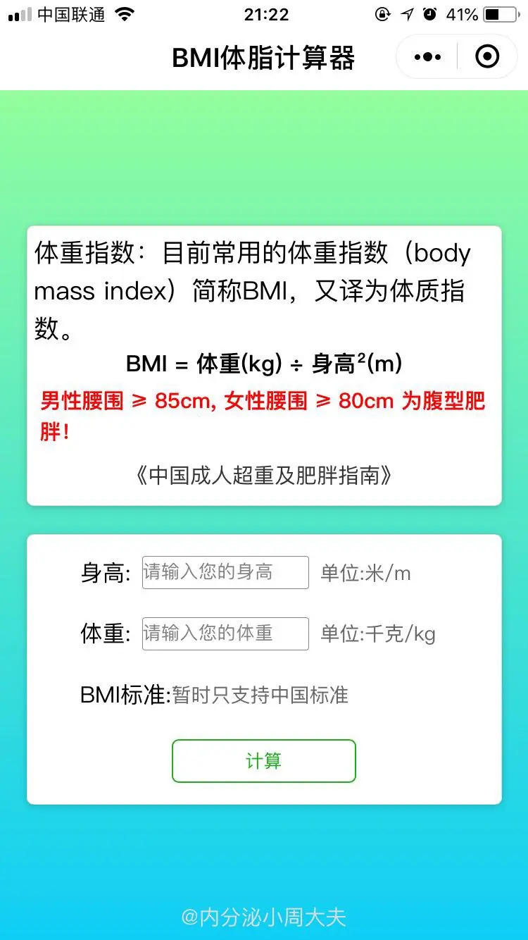 在这里谈设计说实话有点不好意思,完全两个门外汉,O(∩_∩)O哈哈~,哥哥是医生,恰巧对互联网有一些自己的看法,认为现在的医学工具老百姓不太容易用,所以希望做一些老百姓能看懂的。当然,这个体质指数不是很复杂的公式,因为开发第一个,所以先拿很简单的试试,虽然很简单,但是还是用心设计的!
