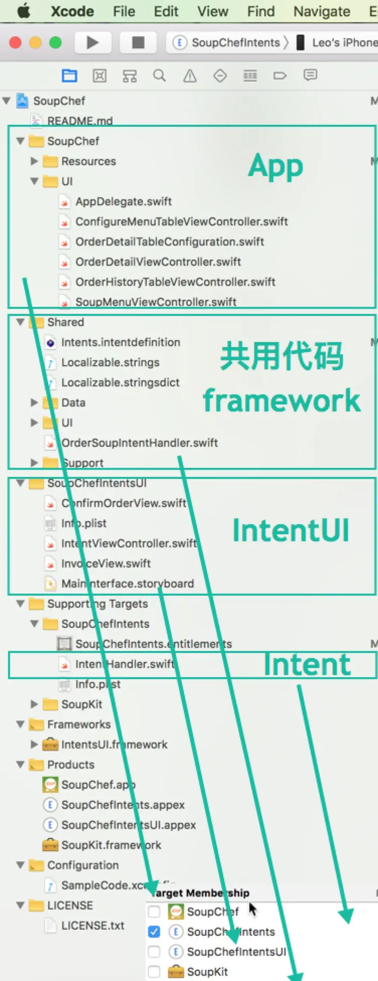 SoupKit.framework, 这样做可以复用代码,因为 Intent 有单独执行的能力,也会用到「汤」的相关逻辑。SoupChef是 App 的 target ;SoupChefIntents这个 target 处理了 Siri Intents 的实际 Handler;SoupChefInetntsUI 处理自定义的 Siri 响应视图;SoupKit包含了共用的「汤」的逻辑,具体逻辑见下图,苹果希望我们使用这种方式来组织我们的 App ,复用更多代码 -
