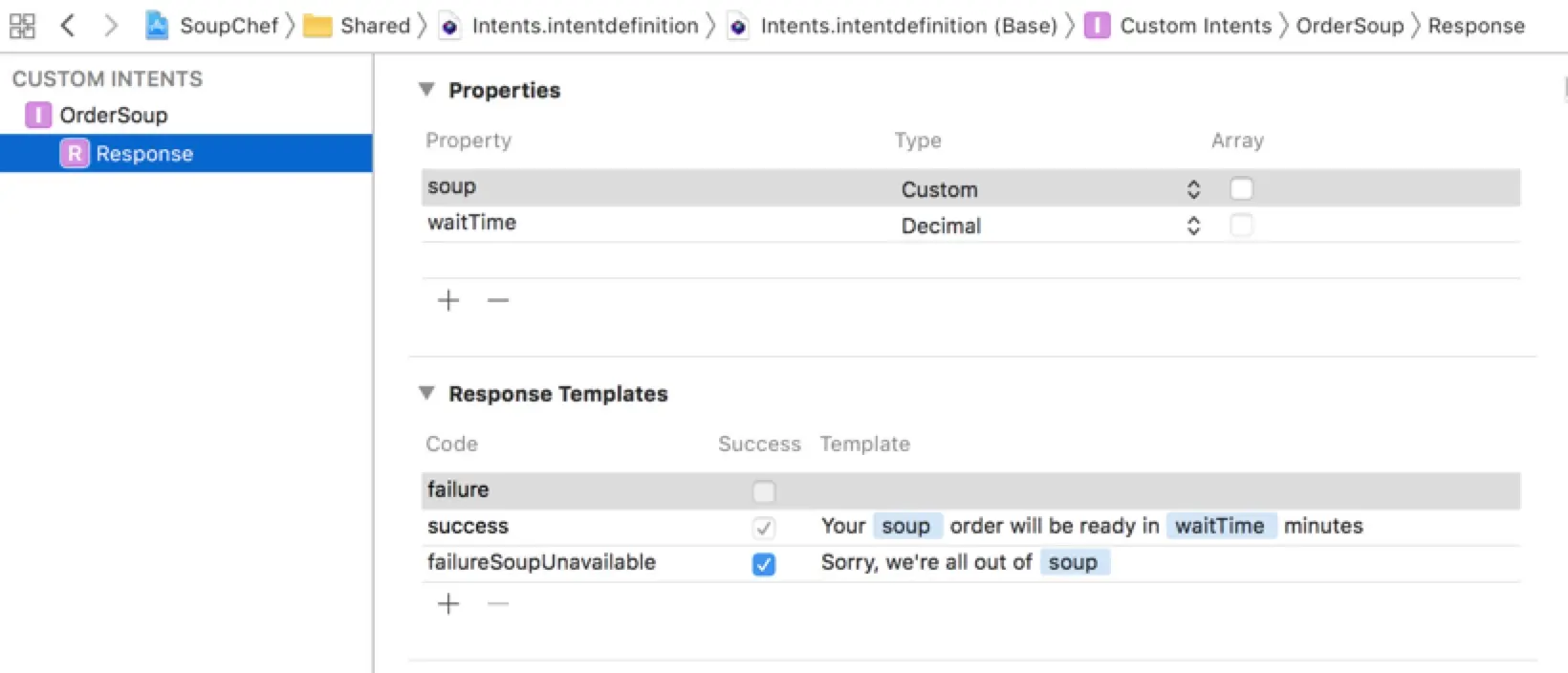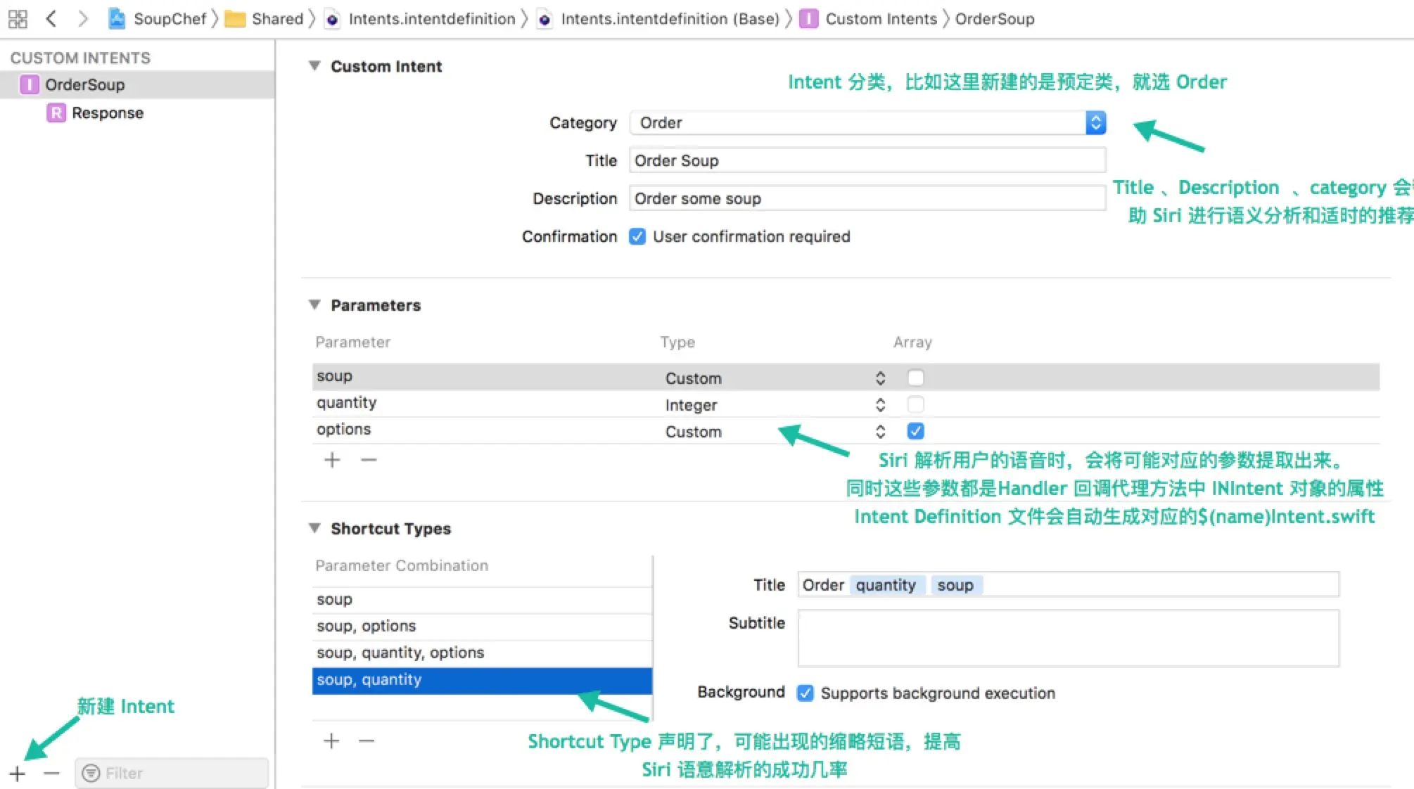 通过以上步骤,就完成了声明一个 Siri Intent ,这个 Intent 描述了用户向 Siri 说 'Order Soup' 的时候响应