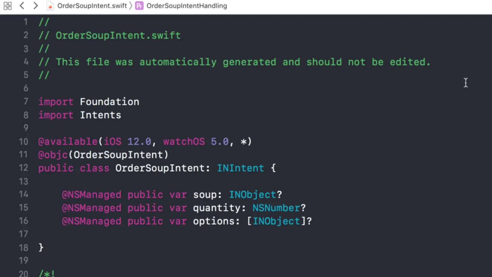 $(name)Intent.swift文件,这个 intent 被关联到SoupKit中,所以编译SoupKit时会生成如下文件 -