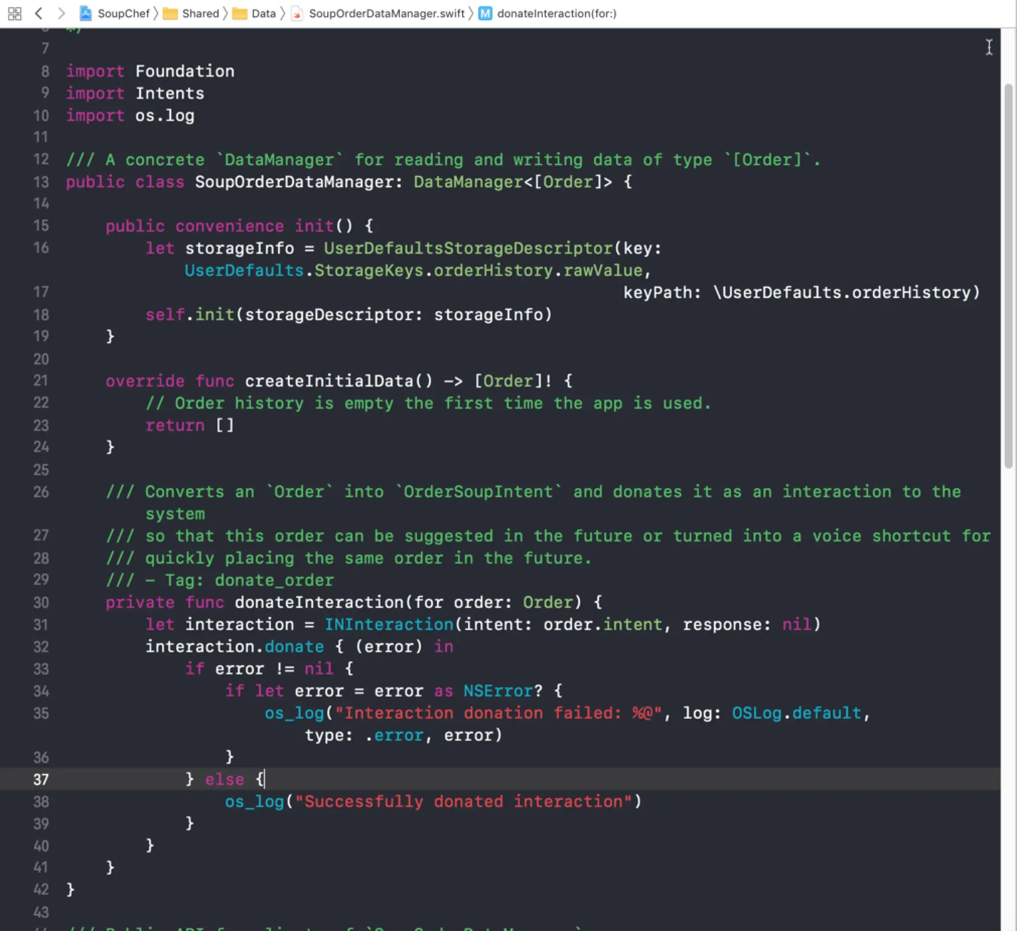 结合订餐这个场景, 每次在用户订完餐后,可以告知 Siri 一个新的 Intent,每次订餐成功后,自己新建一个 Intent 对象,并调用
