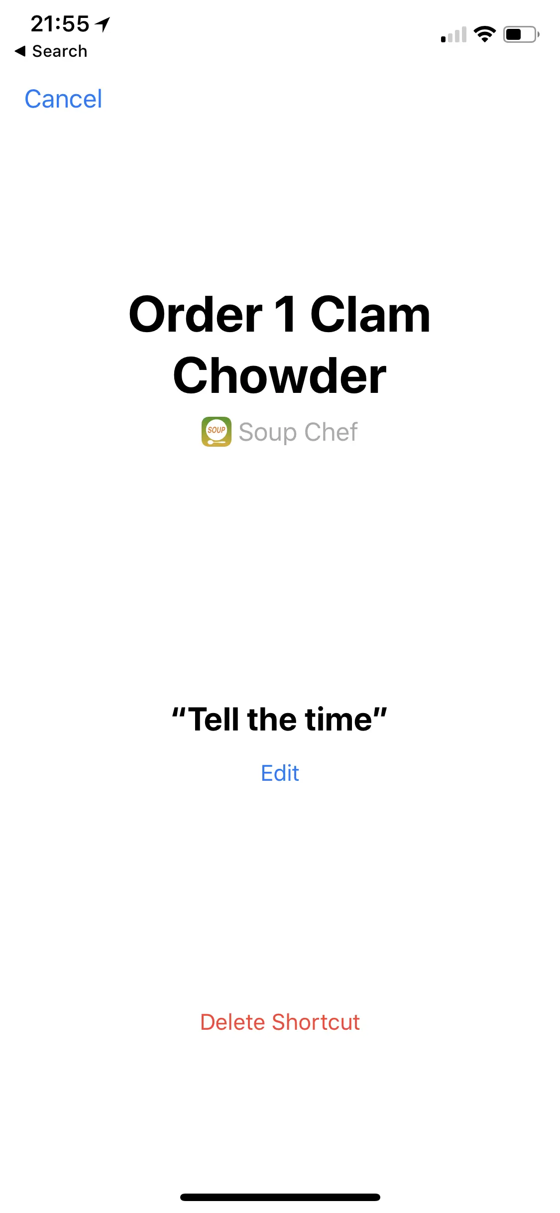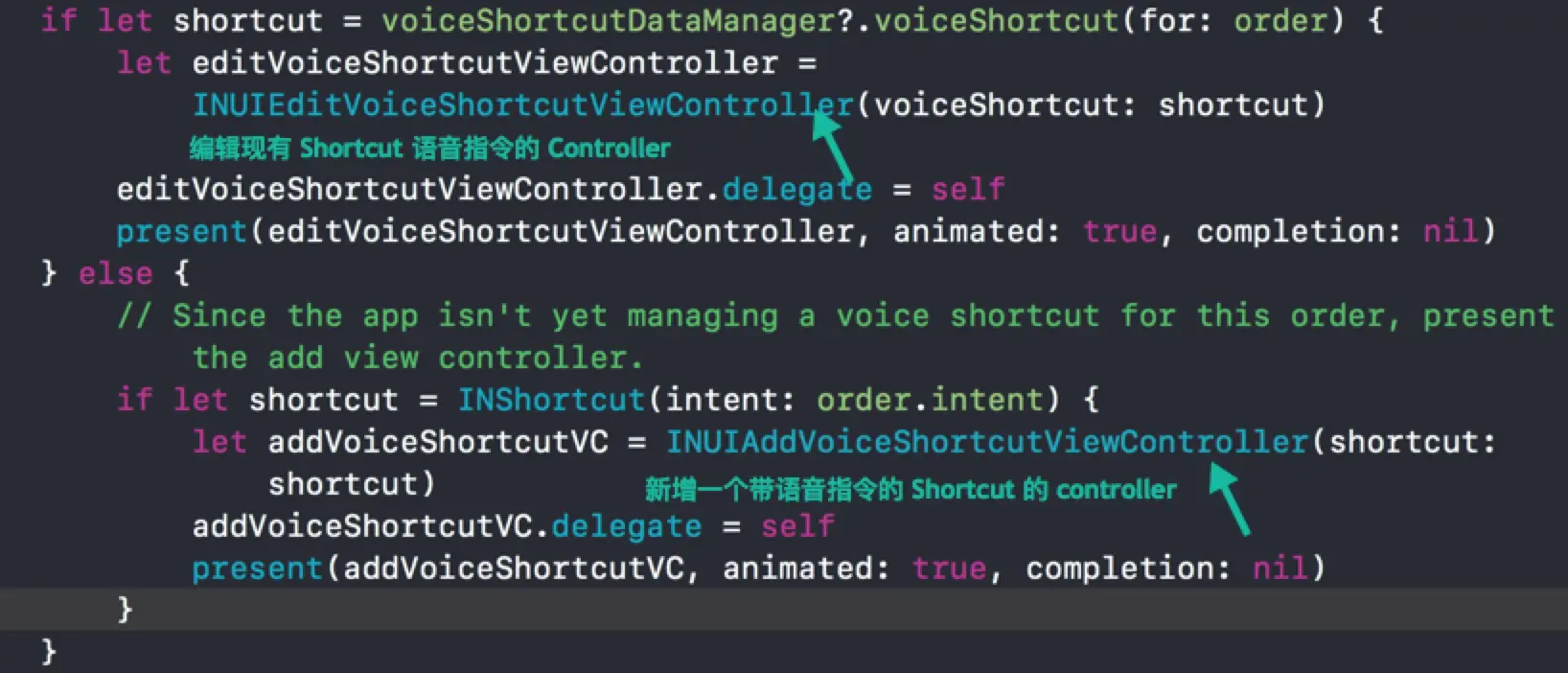 Shortcuts的一大新特性是用户自定义语音,这样的话,用户可以使用自己喜欢的语音指令来完成订餐操作,比如「来碗蛤蜊汤」,如果想要在 App 内让用户自定义语音命名一个 Shortcut,可以通过 PresentINUIAddVoiceShortcutViewController实例来实现,具体方法如下 -