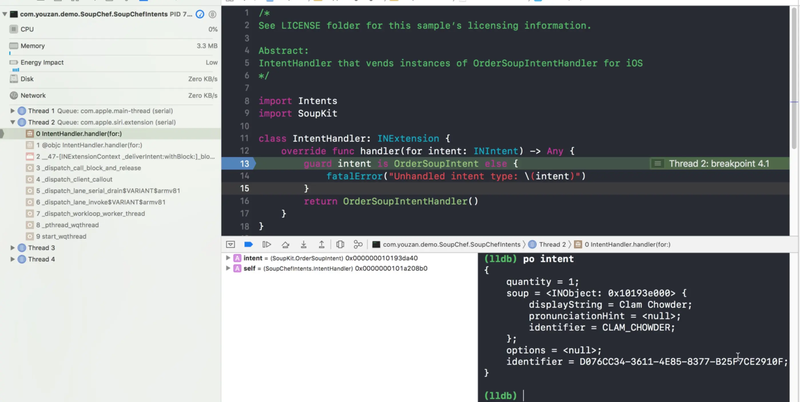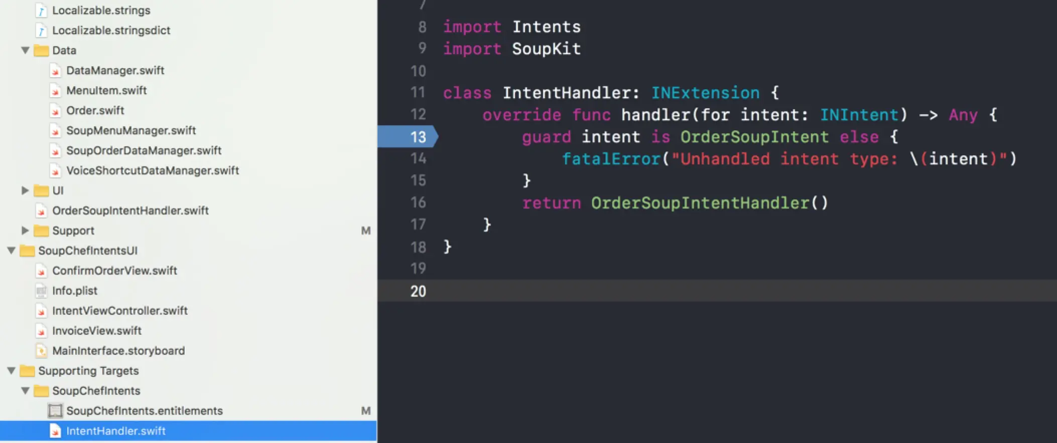 OrderSoupIntent,会包含 soup、quantity、options 等属性,调试时,可以直接将 Siri Intent Extension 也就是SoupChefIntents这个 target 编译到手机上,并选择 Siri 为运行对象,就可以只调试 Handler 相关逻辑,而不运行 App