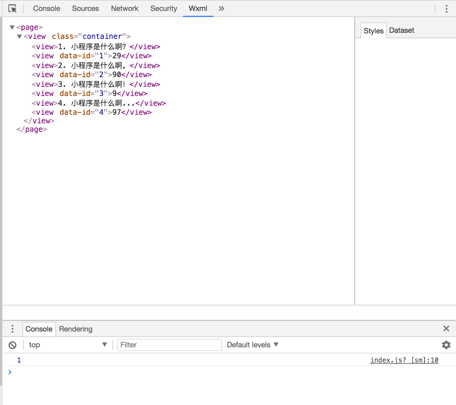 我创建了一个List-Item组件,并在index页面引入,我们在开发者工具看下小程序是怎么渲染的: