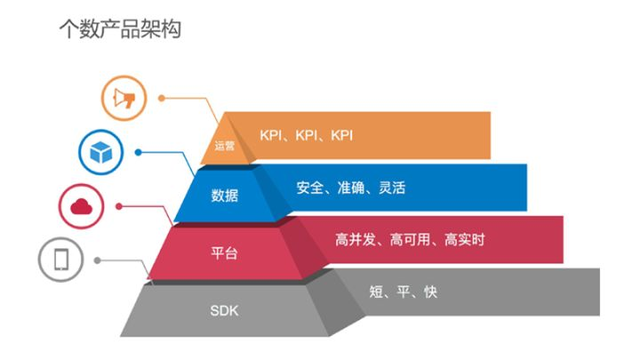 安全、准确、灵活的数据能够保证运营工作的有效开展;而承载数据的平台则需做到高并发、高可用、高实时;SDK作为基础,其核心在于包的体积足够小,并且集成方便,能够快速运行。这样一个从上到下的金字塔,构建起了个数产品。