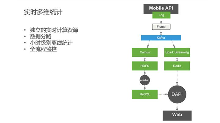 Mobile API从SDK收集到上报的数据,以文件形式Log保存下来,通过Flume进入到Kafka,接下来通过实时与离线两条路进行处理,最后通过数据API封装提供给上层的业务系统使用。