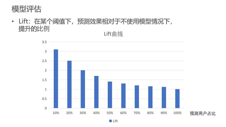 Lift也是一项重要指标,它反映了我们的预测能够产生多大的效果提升。显而易见,筛选的人群比例越大,提升的比例会逐渐递减。具体应用的时候,我们需要根据场景或需求来选择一个合理的值。