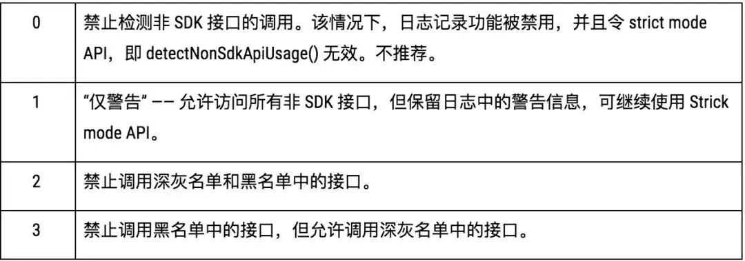 - 从 Beta 1 开始,开发者可以使用 StrictMode 中的 permitNonSdkApiUsage() 以及 detectNonSdkApiUsage() 方法,在非 SDK 接口被调用时会收到回调,如添加一条日志。
