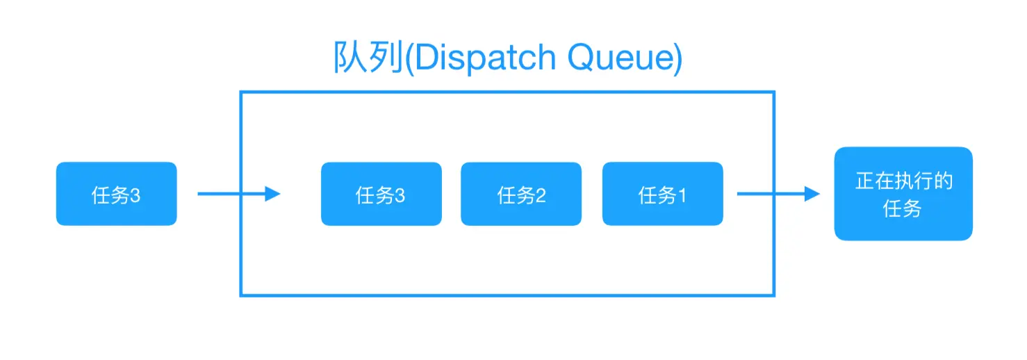 队列(Dispatch Queue):这里的队列指执行任务的等待队列,即用来存放任务的队列。队列是一种特殊的线性表,采用 FIFO(先进先出)的原则,即新任务总是被插入到队列的末尾,而读取任务的时候总是从队列的头部开始读取。每读取一个任务,则从队列中释放一个任务。队列的结构可参考下图: