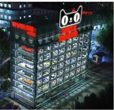“汽车自动贩卖机”像一个多层停车库,某种程度上类似一个巨大自动售货机,直接向消费者销售汽车。消费者通过手机天猫浏览车库中的汽车,要么选择立即购买,要么试驾,确定后汽车便从底层地面被交付。