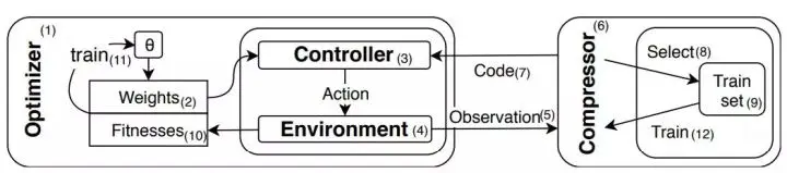 图 1:系统图示。在每个生成阶段,优化器(1)为神经网络控制器(3)生成权重集合(2)。每个权重都是偶发地(episodically)通过环境进行评估(4)。在每一步,环境将观测结果(5)发送到外部压缩器(6),压缩器生成紧凑编码(7)作为网络输入。压缩器为训练集(9)选择观测结果(8)。在该 episode 结束时,环境向优化器返回适应度分数(累计奖励,10)进行训练(神经进化,11)。压缩器训练(12)发生在生成阶段。