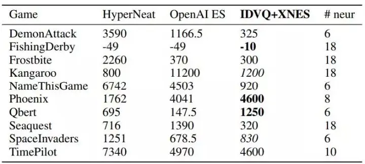 表 1:本研究提出方法在 Atari 游戏样本上与 HyperNeat [HLMS14] 和 OpenAI ES [SHC+17] 的对比结果。所有方法都是从头开始在原始像素输入上训练的。HyperNeat 列的结果使用的网络具备一个包含 336 个神经元的隐藏层。OpenAI ES 列中的结果使用两个包含 64 个神经元的隐藏层。IDVQ+XNES 列的结果未使用隐藏层。列 # neur 表示单个(输出)层中使用的神经元数量。粗体数字表示设置条件下最好的分数,斜体数字表示中间分数。