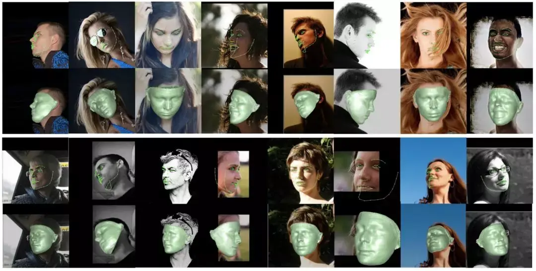 上图是该方法的部分结果,奇数行是人脸对齐结果 (仅显示 68 点),偶数行是 3d 重建结果