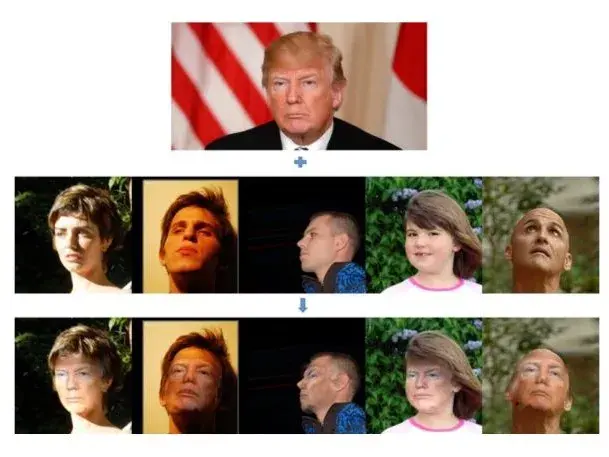 换脸:使用另一个人的脸部替换某个特定图像中的面部,并可以适应该图像中人脸的姿势。