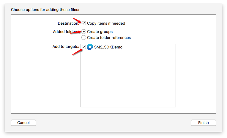将下图中红色框标记的文件夹(包含MOBFoundation.framework 和 SMS_SDK.framework)拖入到工程中
