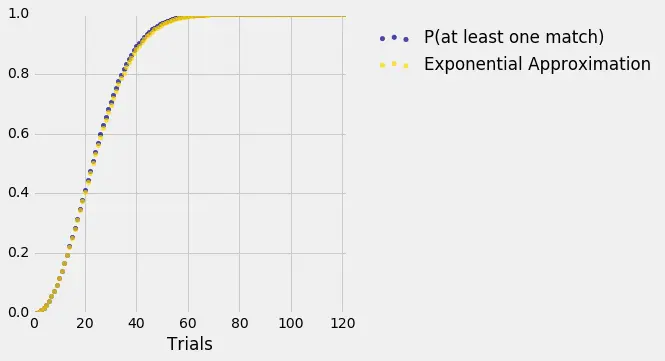 | Trials | P(at least one match) | Exponential Approximation |