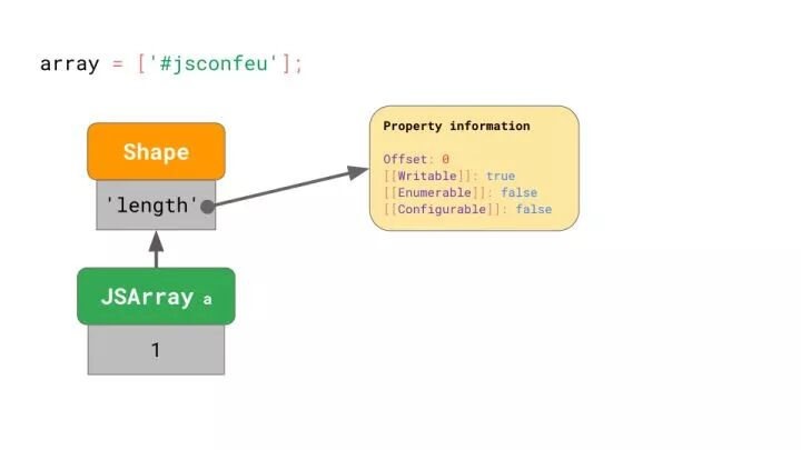引擎存储了数组长度(1),并指向包含 offset 和 'length' 特性属性的 Shape。
