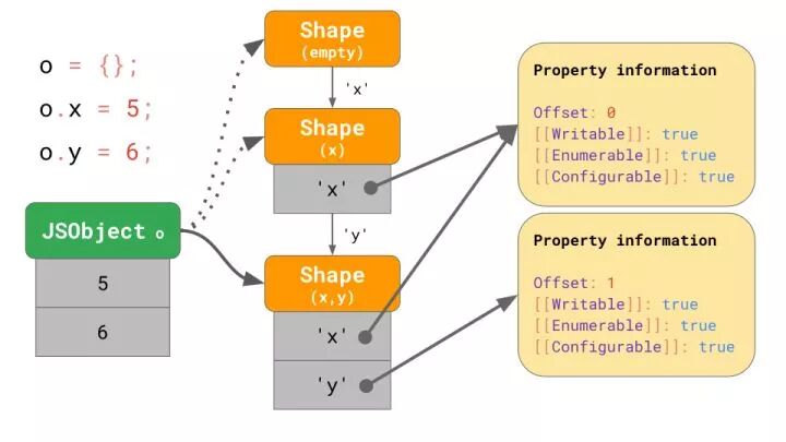 该对象在初始化时没有任何属性,因此它指向一个空的 shape。下一个语句为该对象添加值为 5 的属性 “x”,所以 JavaScript 引擎转向一个包含属性 “x” 的 Shape,并向 JSObject 的第一个偏移量为 0 处添加了一个值 5。 接下来一个语句添加了一个属性 'y',引擎便转向另一个包含 'x' 和 'y' 的 Shape,并将值 6 附加到 JSObject(位于偏移量 1 处)。