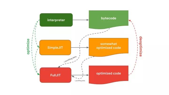 一般来说,所有 JavaSciript 引擎都有一个包含解释器和优化编译器的处理流程。其中,解释器可以快速生成未优化的字节码,而优化编译器会需要更长的时间,以便最终生成高度优化的机器码。
