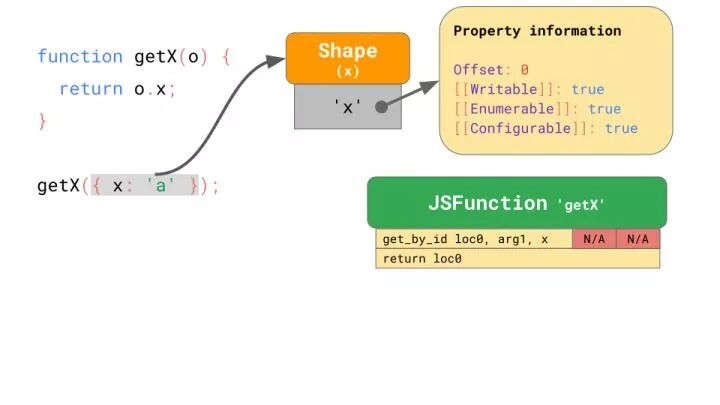 现在让我们假设我们用对象 {x:'a'} 调用 getX 函数。正如我们所知,这个对象有一个包含属性 'x' 的 Shape,该 Shape 存储了属性 x 的偏移量和其他特性。当你第一次执行该函数时,get_by_id 指令将查找属性 'x',然后发现其值存储在偏移量 0 处。