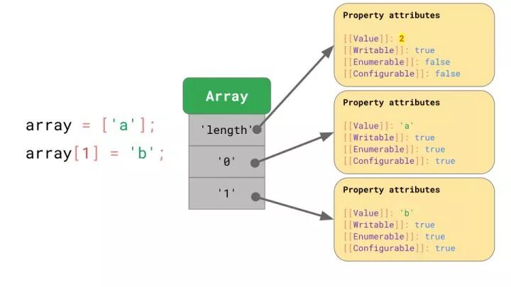 高效存储数组对于数组来说,存储属性诸如数组索引等是非常常见的。这些属性的值被称为数组元素。存储每个数组中的每个数组元素的属性特性(property attributes)将是一种很浪费的存储方式。相反,由于数组索引默认属性是可写的、可枚举的并且可以配置的,JavaScript 引擎利用这一点,将数组元素与其他命名属性分开存储。
