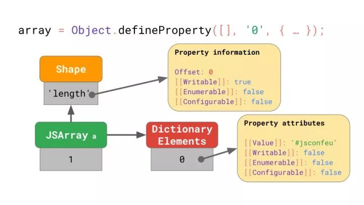 在这种边缘情况下,JavaScript 引擎会将全部的 elements backing store 表示为一个由数组下标映射到属性特性的字典。
