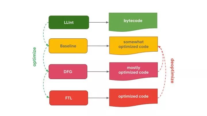 JavaScriptCore(缩写为 JSC),Apple 的 JavaScript 引擎,被用于 Safari 和 React Native 两个项目中,它通过三种不同的优化编译器使效果达到极致。低级解释器 LLInt 将代码解释后传递给 Baseline 编译器,而(经过 Baseline 编译器)优化后的代码便传给了 DFG 编译器,(在 DFG 编译器处理后)结果最终传给了 FTL 编译器进行处理。