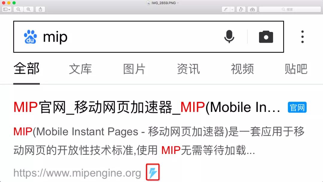 在使用手机浏览器搜索时,使用了 MIP 或 AMP 的网站在搜索结果中会显示一个闪电的标志。