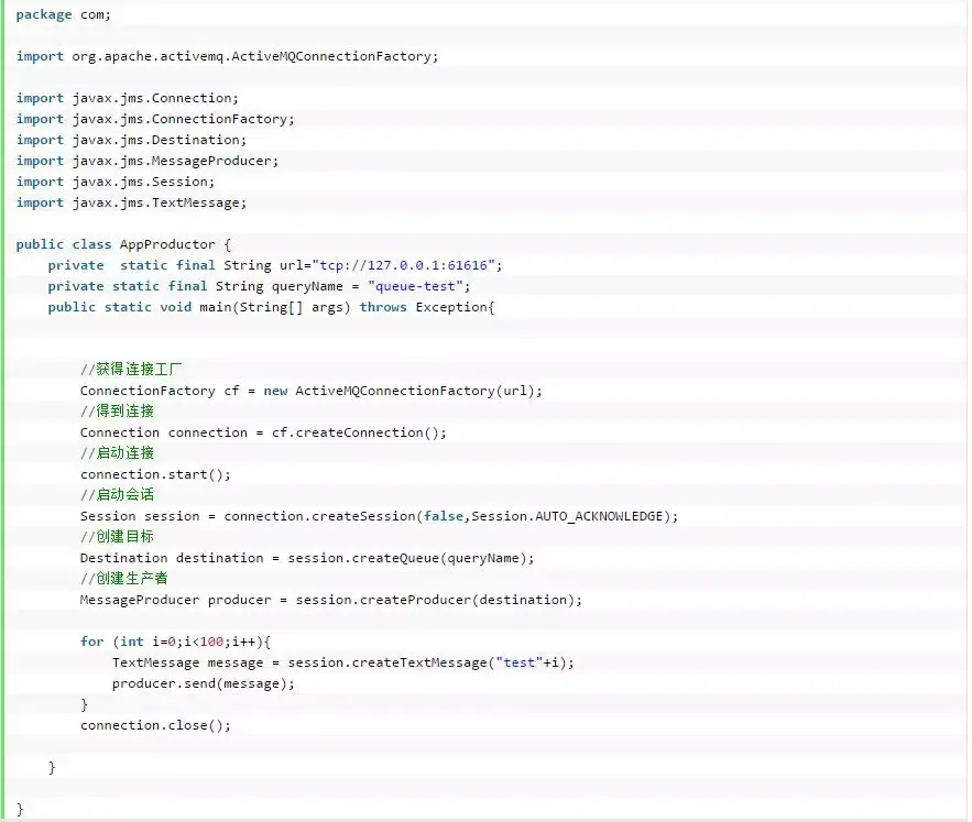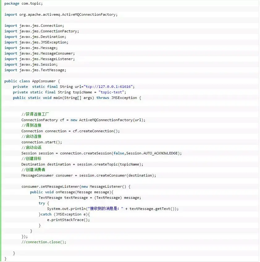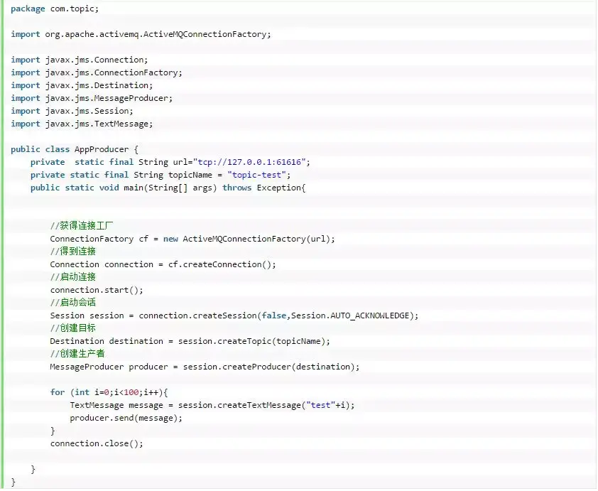ActiveMQ的主题模式和队列模式代码大同小异,只需要关注主题模式是发布订阅模型、队列模式是生产者消费者模型。发布订阅是一种广播形式,可以用来做消息同步,而生产者消费者模型可以用来做负载均衡。