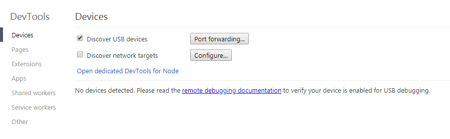 1.在chrome浏览器地址栏输入:chrome://inspect/#devices,打开浏览器开发工具设置。
