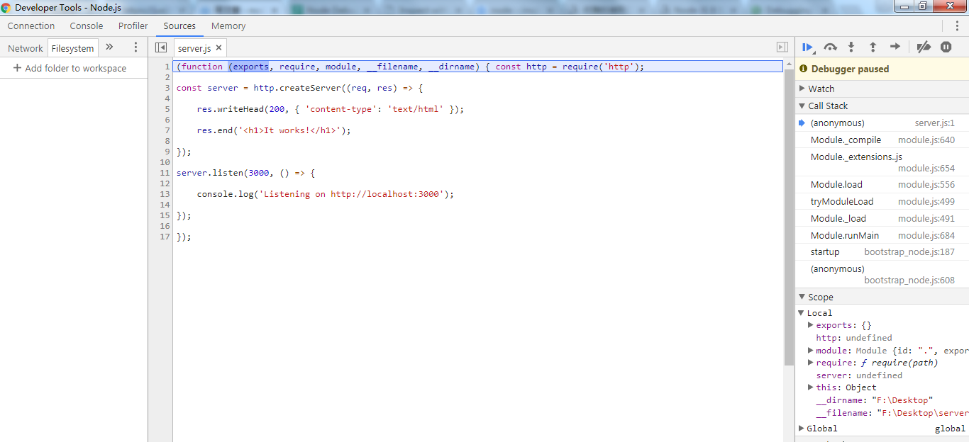 3.使用node命令,对某个特定的文件进行调试,该命令是:node --inspect-brk 加上调试文件的路径。例如:node --inspect-brk F:\Desktop\server.js,对桌面上的server.js进行调试。 此命令的含义是在js的第一行打断点调试。