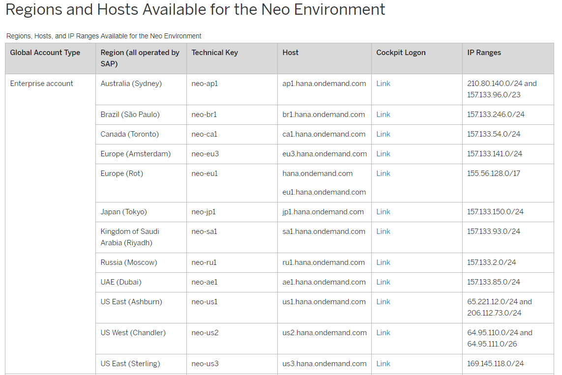 SAP help里提供了CloudFoundry和Neo环境下可用的Region和API endpoint: