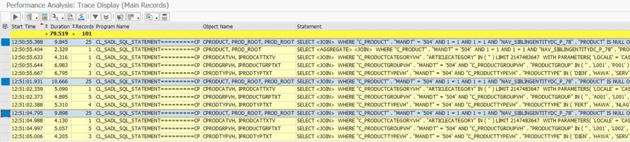 再来看看搜索分页的后台处理。在Netweaver事务码ST05的数据库跟踪视图里,能清晰观察到这个分页效果:每次到数据库的查询只命中并返回25条记录,如下图三条高亮的跟踪记录所示。