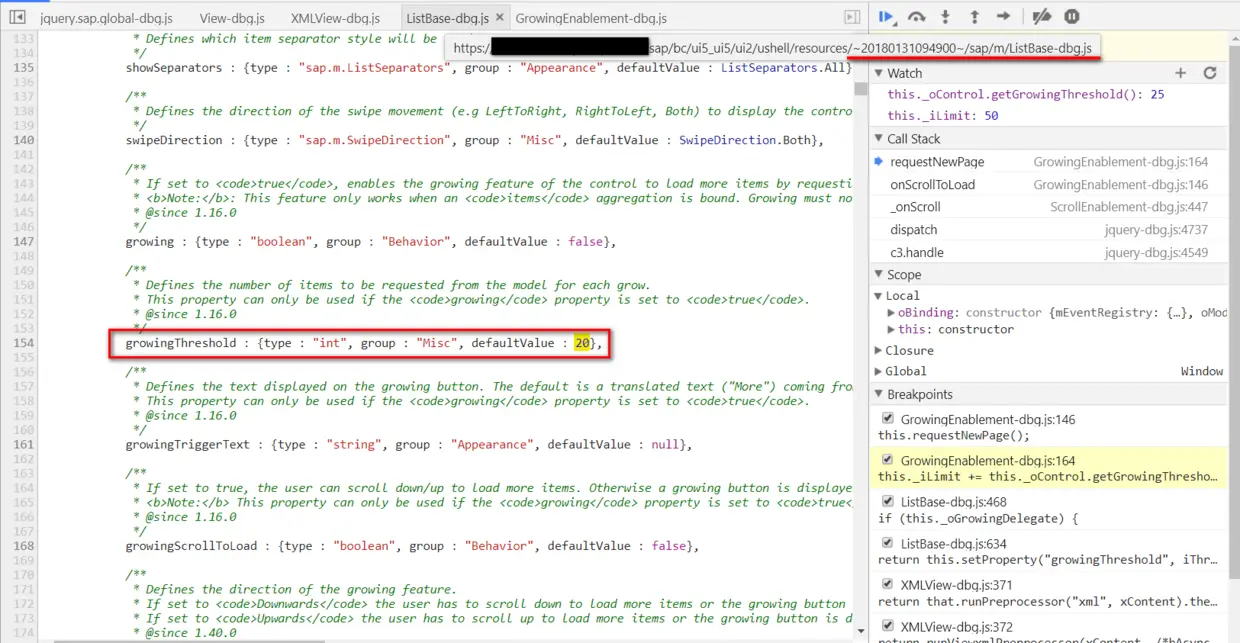 为什么分页的尺寸为25?在Fiori UI列表实现文件sap.m.ListBase.js里,默认的分页尺寸(GrowingThreshold)为20,这说明一定存在某个配置,或者在Product Master应用某处的JavaScript代码将这个分页尺寸从20改成了25。