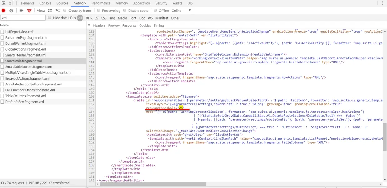 由于篇幅限制,Jerry直接揭晓答案了。S/4HANA里的Fiori应用都是使用Smart Template技术实现的,其列表区域的实现位于SmartTable.fragment.xml这个模板文件里,growingThreshold指定为25。因为从时间序列上来说SmartTable.fragment.xml后于sap.m.ListBase.js加载,所以对于分页尺寸的定义其优先级更高。