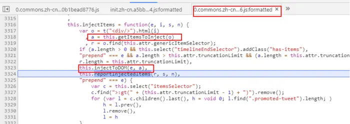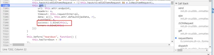 为了搞清楚这些信息到底是怎么回事,我们通过寻找请求的发起者来深入到代码当中。原来Twitter在这里发送了一个XMLHttpRequest。无论是什么请求,总归要有一个处理的方法,我们在Call Stack中层层向上追溯,然后找到了请求的定义位置。