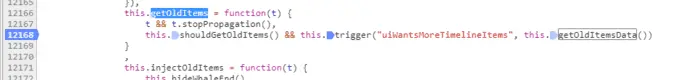 那min_position和max_position呢?我们回到刚才定义请求的位置继续向上追溯,找到了getOldItems的方法。当用户在时间轴上向下滚动鼠标到最后时,就会调用到这个方法,而在其中会把上一次响应当中的min_position赋值给这一次请求当中的max_postion。