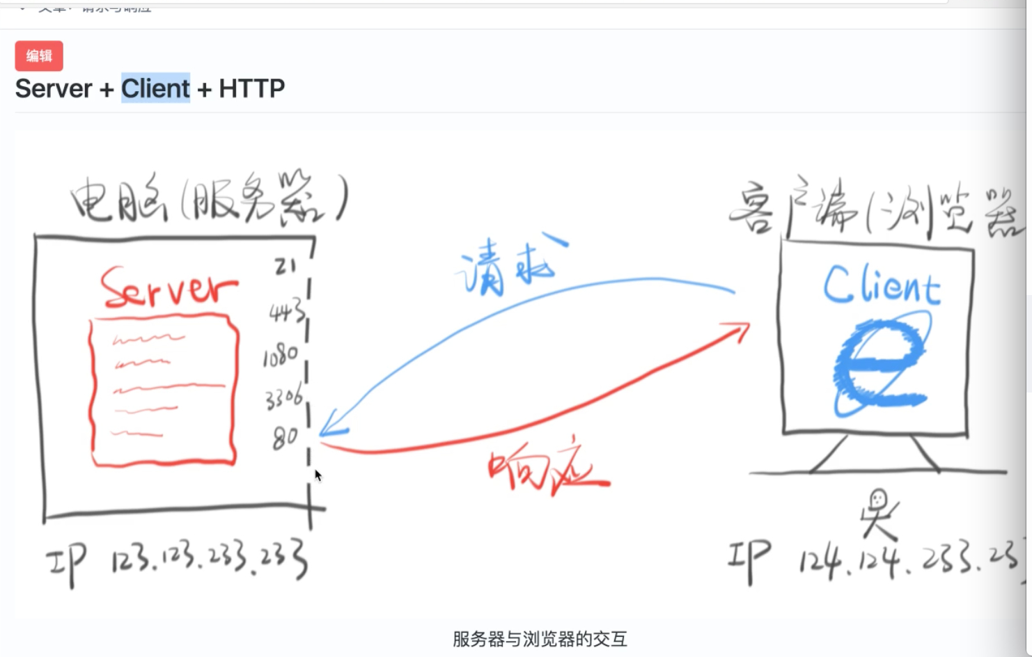 上图的交互:首先在浏览器中输入一个网址,然后通过dns解析,获取到对应服务器的ip,然后向这个Ip发送请求,服务器通过80端口接收请求。然后服务器就给客户端响应一个网页。然后浏览器就去下载这个网页。双方都知道各自的IP,所以可以通信。