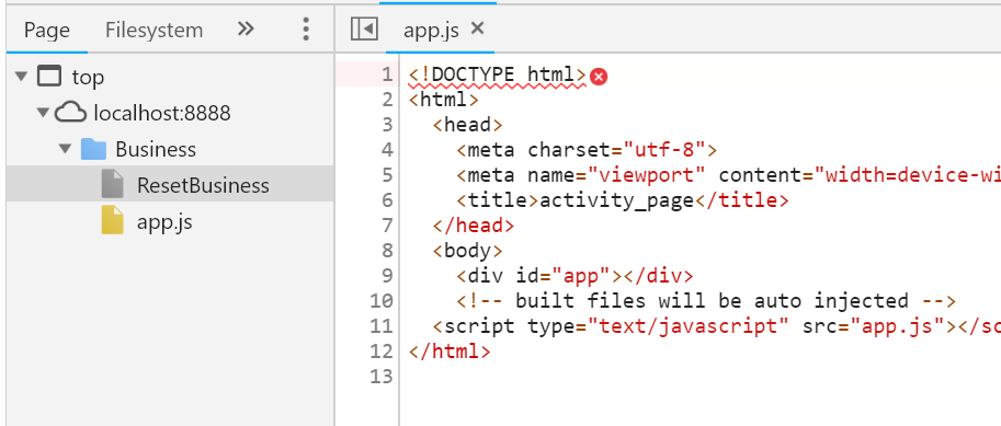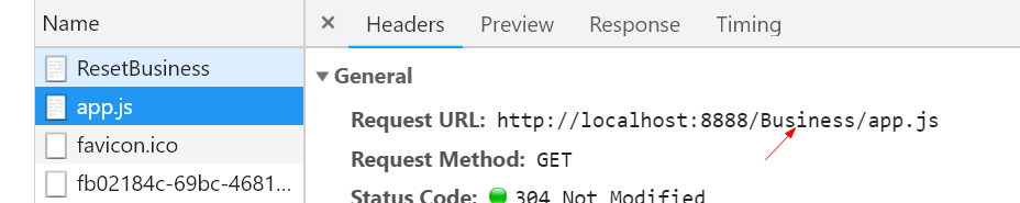 这是不对的,app.js的请求路径竟然多了一个Business。而打包后的app.js是在根目录的,如果用相对路径请求的话,肯定是请求不到的。app的正确地址就是应该是这个才对。http://localhost:8888/app.js