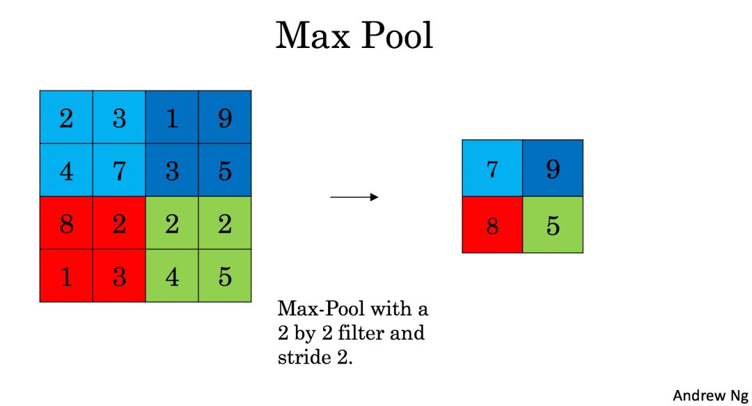 最大池化层:在输入上滑动(f,f)窗口,并将窗口的最大值存储在输出中。