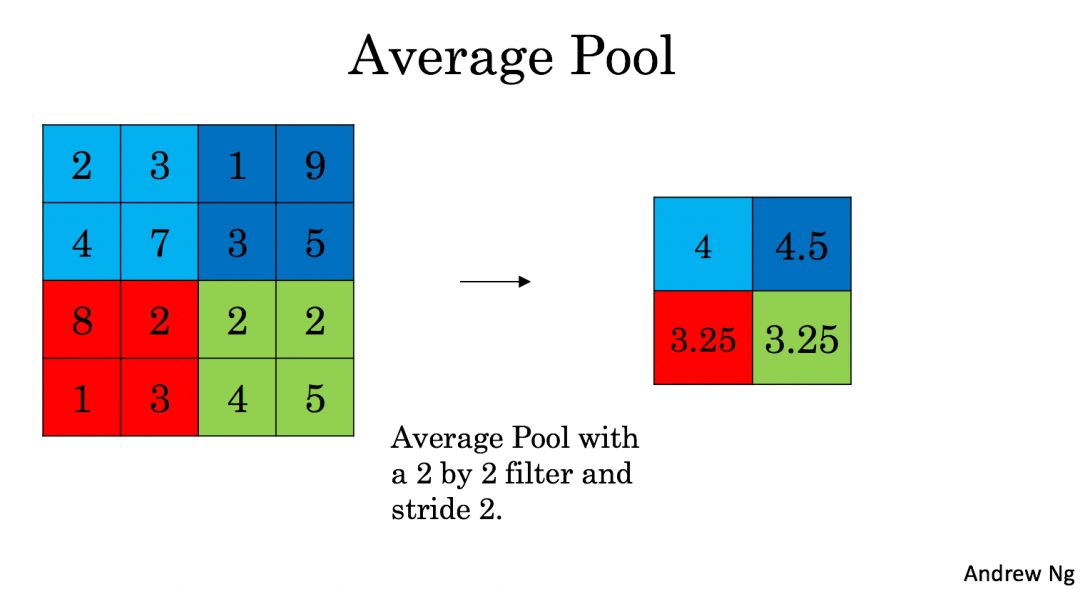 平均池化层:在输入上滑动(f,f)窗口,并将窗口的平均值存储在输出中。