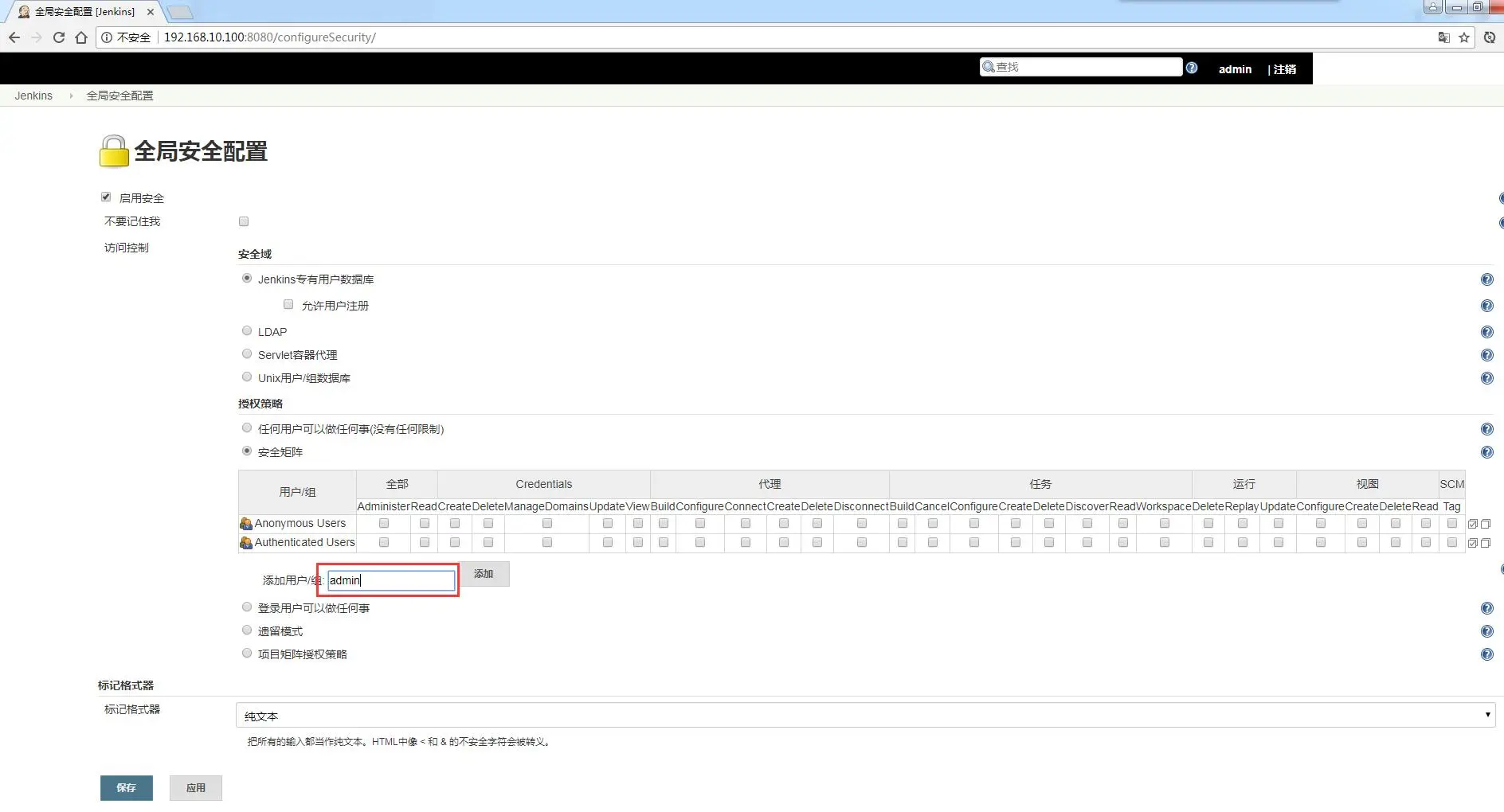 在授权策略中选择 “安全矩阵”,添加用户,输入我们安装 Jenkins 时设置的用户名。