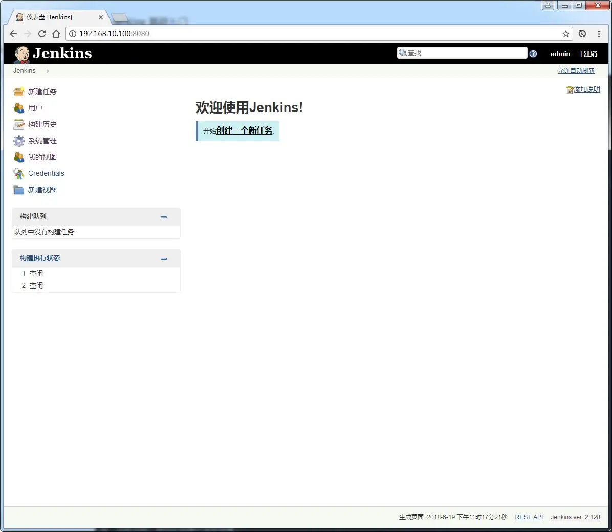 启动成功后,打开浏览器访问:http://192.168.10.100:8080 来到 Jenkins 初始化首页,按照提示设置即可,最终会看到如下界面: