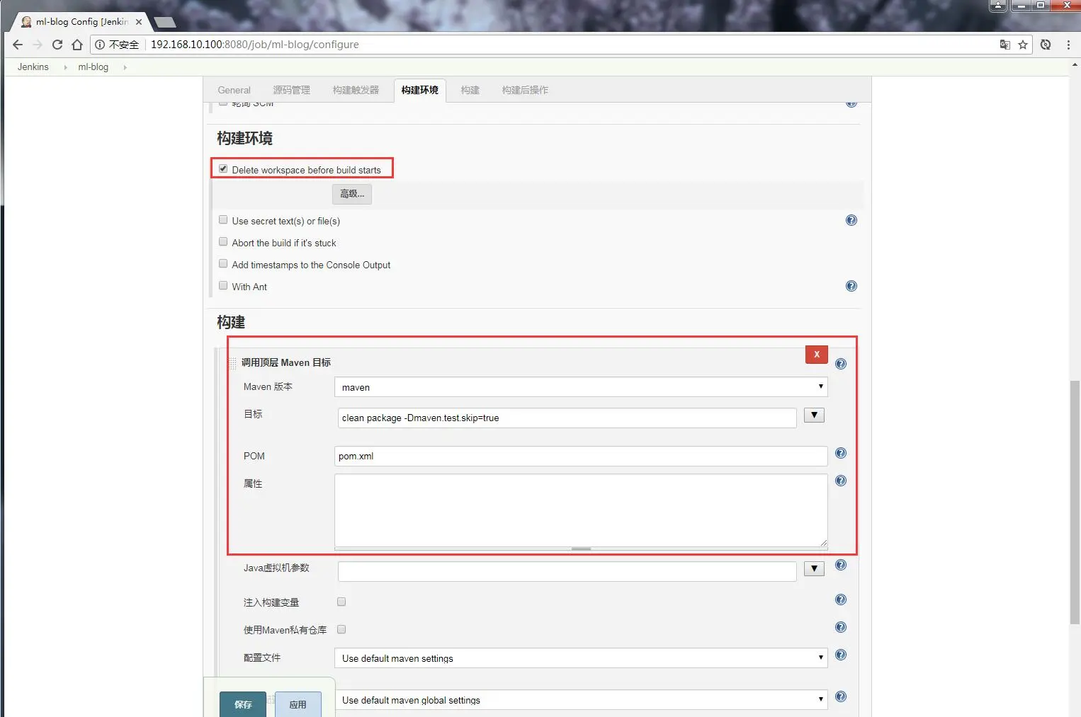 点击 “增加构建步骤”,选中 “调用顶层 Maven 目标”,设置 maven 执行的命令:clean package -Dmaven.test.skip=true,如下图:
