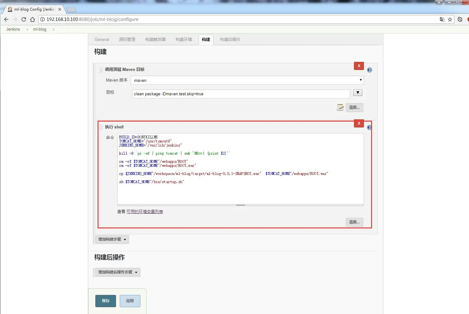 cp $JENKINS_HOME"/workspace/ml-blog/target/ml-blog-0.0.1-SNAPSHOT.war" $TOMCAT_HOME"/webapps/ROOT.war"